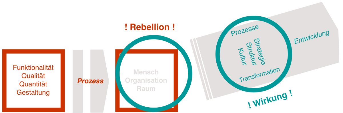 Eben dieser zeitliche Treffpunkt von Transformationsaktivität und Raum- bzw. Gebäudeplanung ist oftmals herausfordernd für die entscheidenden Personen, aber gleichzeitig Beginn der Raumrebellion! Aus der Theorie geht’s in Richtung Praxis. Erste Schritte werden gemacht, die sofort auf die Menschen und die Organisation wirken.